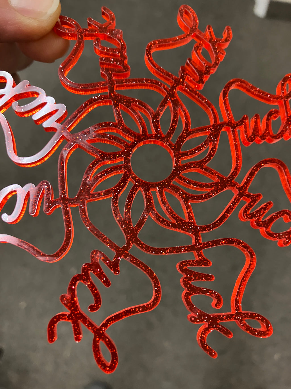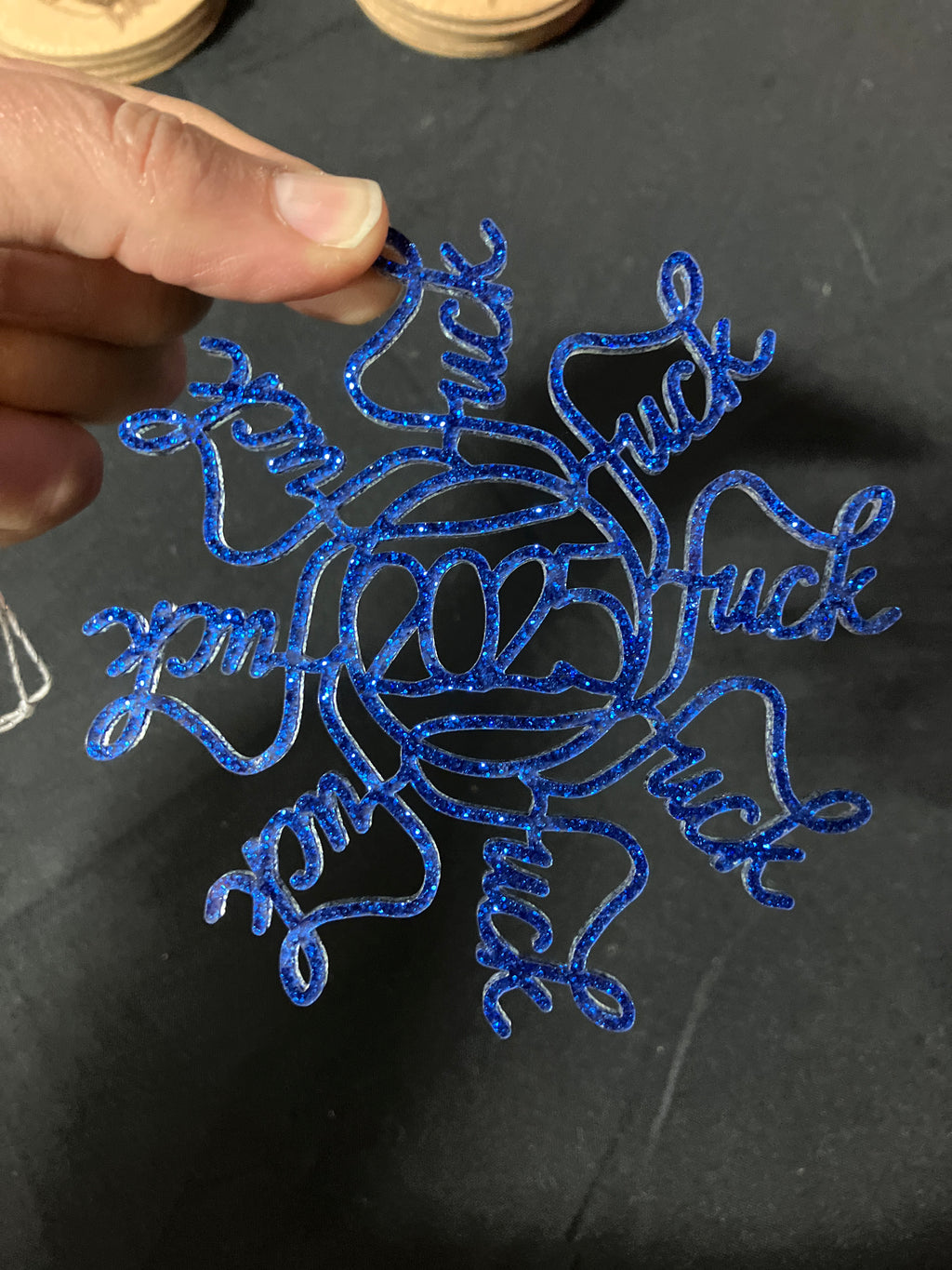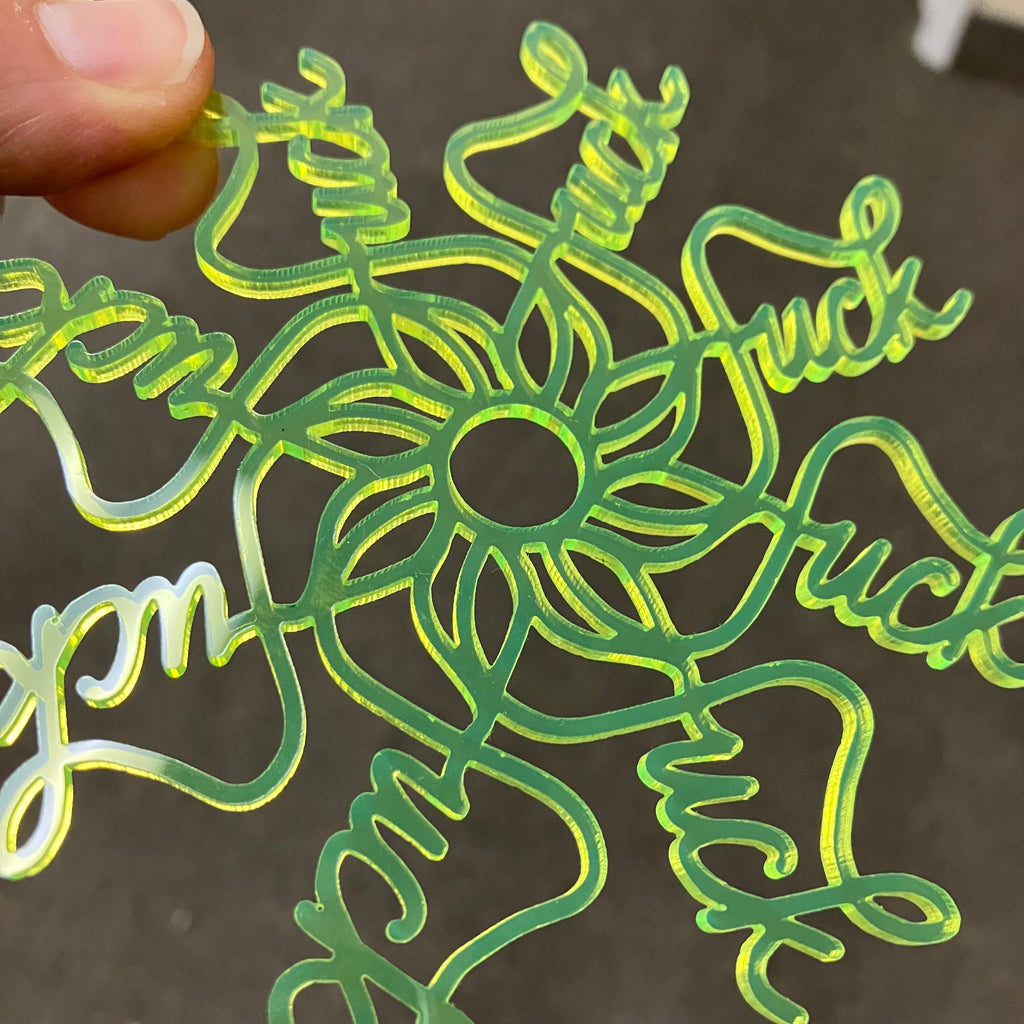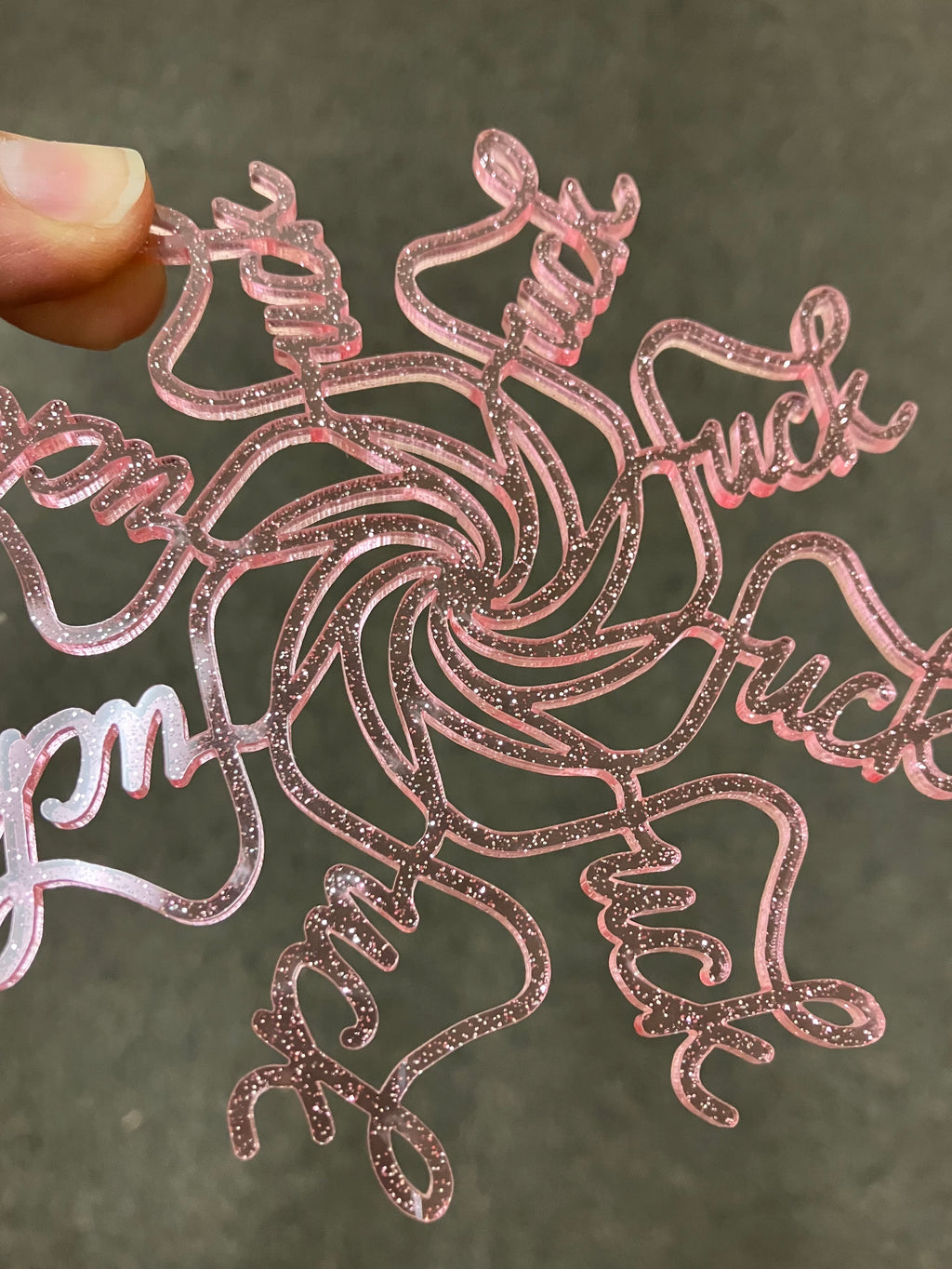 A beautiful snowflake ornament, but consisting of the word "fuck". There are 4 versions of the center pattern, see photos. Flower has the hole in the middle and the leaf pattern, Vortex is the spikey spiral. Color choices are a subset of Swift colors shown here.