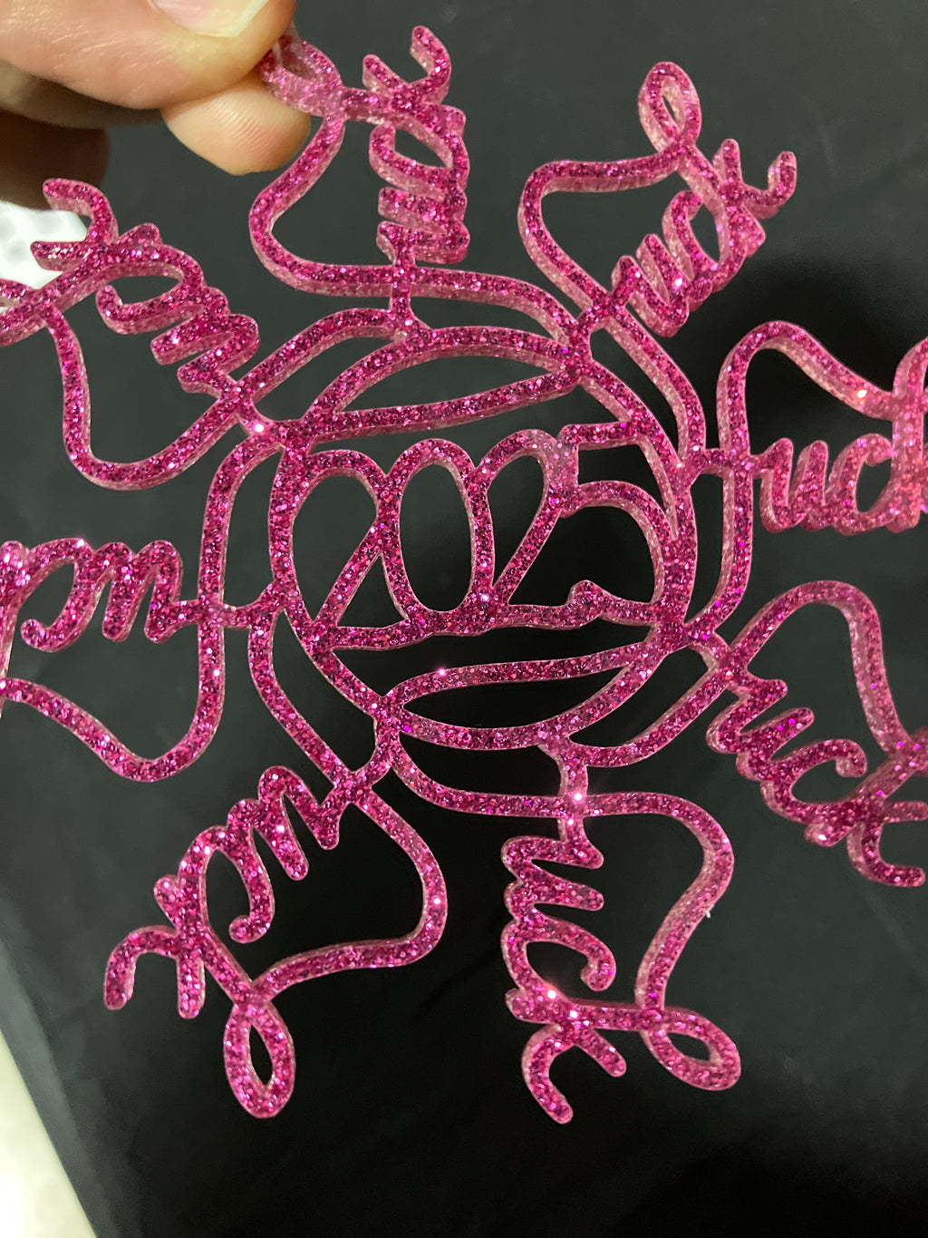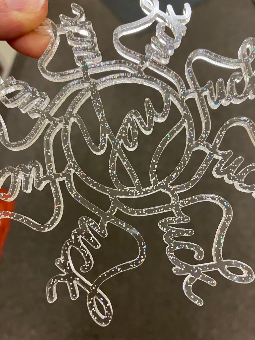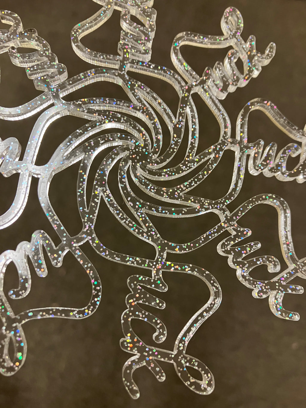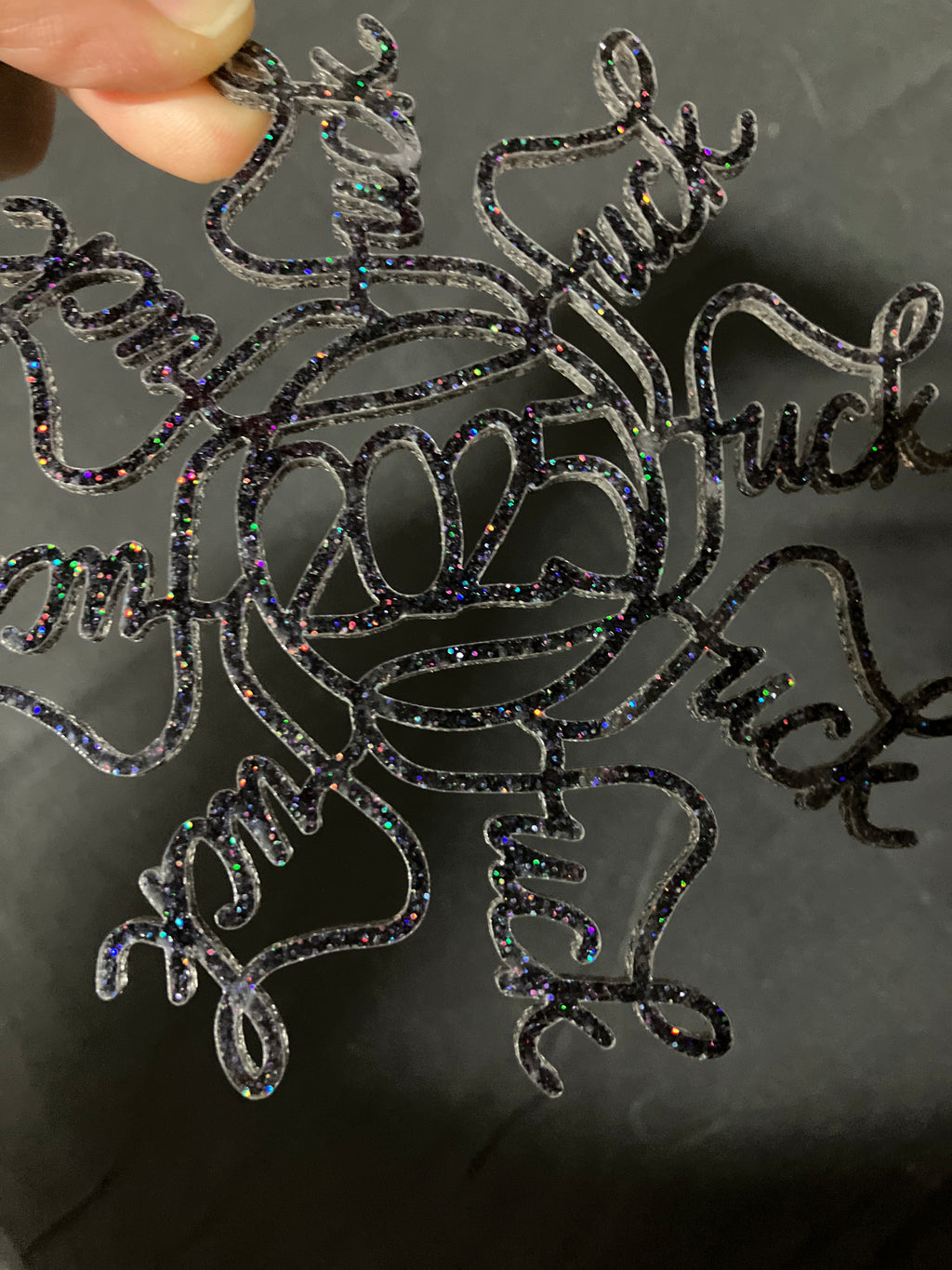 A beautiful snowflake ornament, but consisting of the word "fuck". There are 4 versions of the center pattern, see photos. Flower has the hole in the middle and the leaf pattern, Vortex is the spikey spiral. Color choices are a subset of Swift colors shown here.