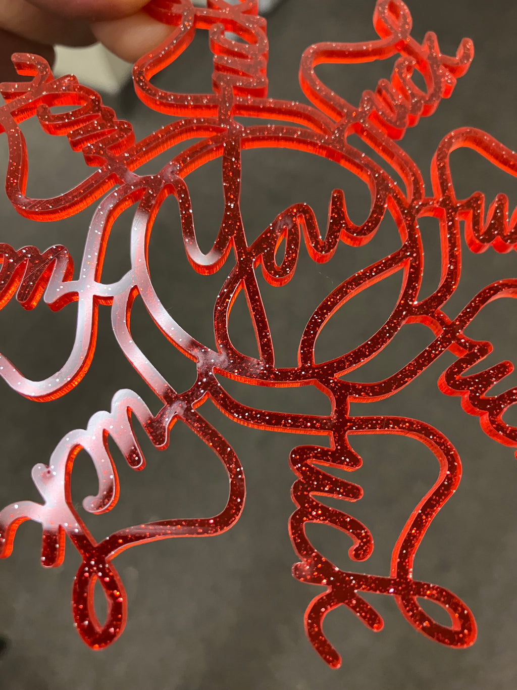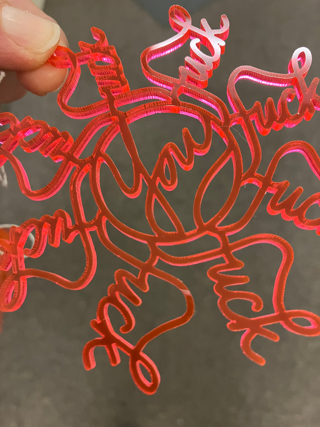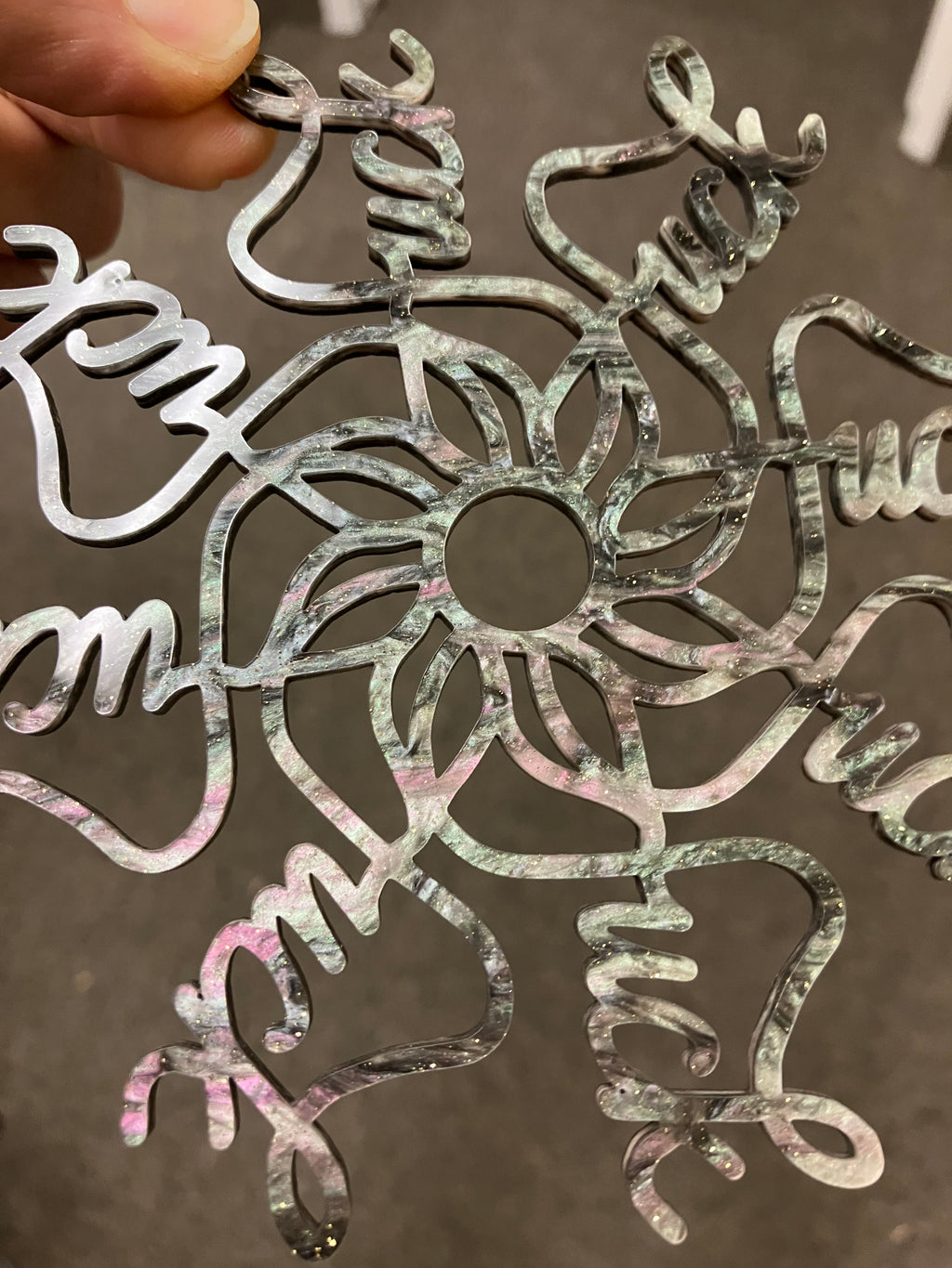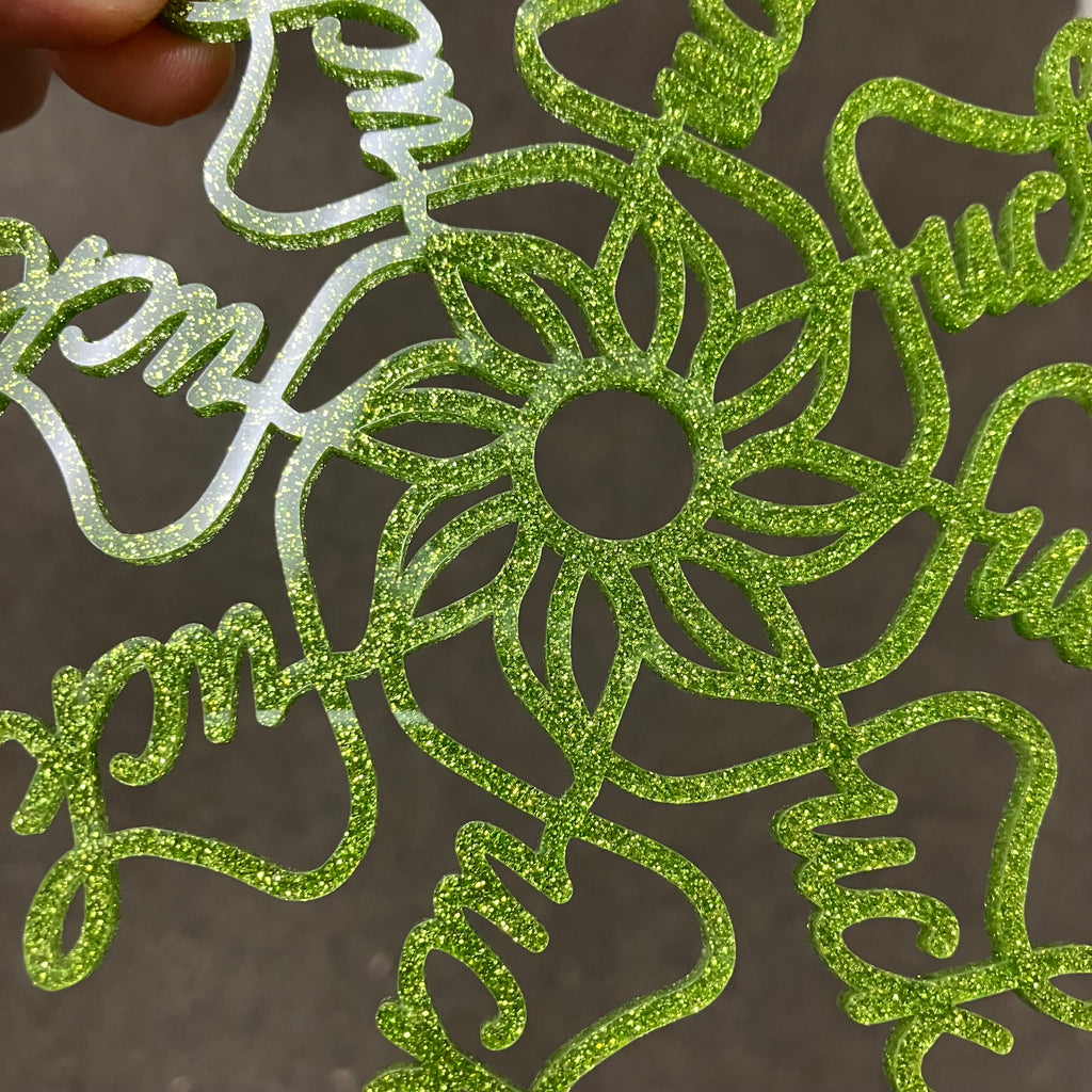 A beautiful snowflake ornament, but consisting of the word "fuck". There are 4 versions of the center pattern, see photos. Flower has the hole in the middle and the leaf pattern, Vortex is the spikey spiral. Color choices are a subset of Swift colors shown here.