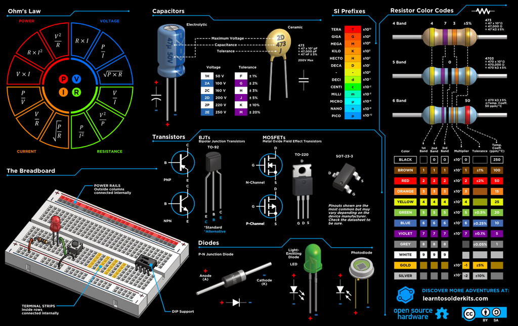It is printed with a colorful electronics cheat sheet to serve as a quick and friendly reference for your journey through the world of electronics.