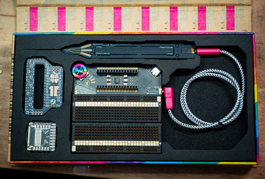 You can connect any point to any other using software-defined jumpers, so the four individually programmable ±8 V power supplies; ten GPIOs; and seven management channels for voltage, current, and resistance can all be connected anywhere on the breadboard or the Arduino Nano header. RGB LEDs under each hole turn the breadboard itself into a display that provides real-time information about whatever’s happening in your circuit.
