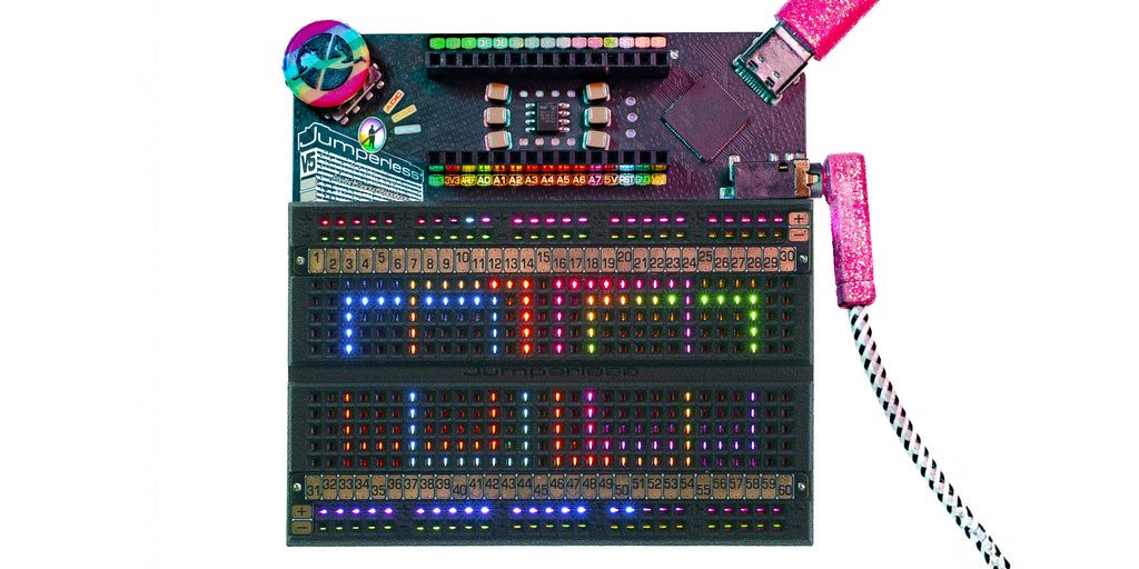 Jumperless V5 lets you prototype like a nerdy wizard who can see electricity and conjure jumpers with a magic wand. It’s an Integrated Development Environment (IDE) for hardware, with an analog-by-nature RP2350B-based dev board, a drawer full of wires, and a workbench full of test equipment (including a power supply, a multimeter, an oscilloscope, a function generator, and a logic analyzer) all crammed inside a breadboard.