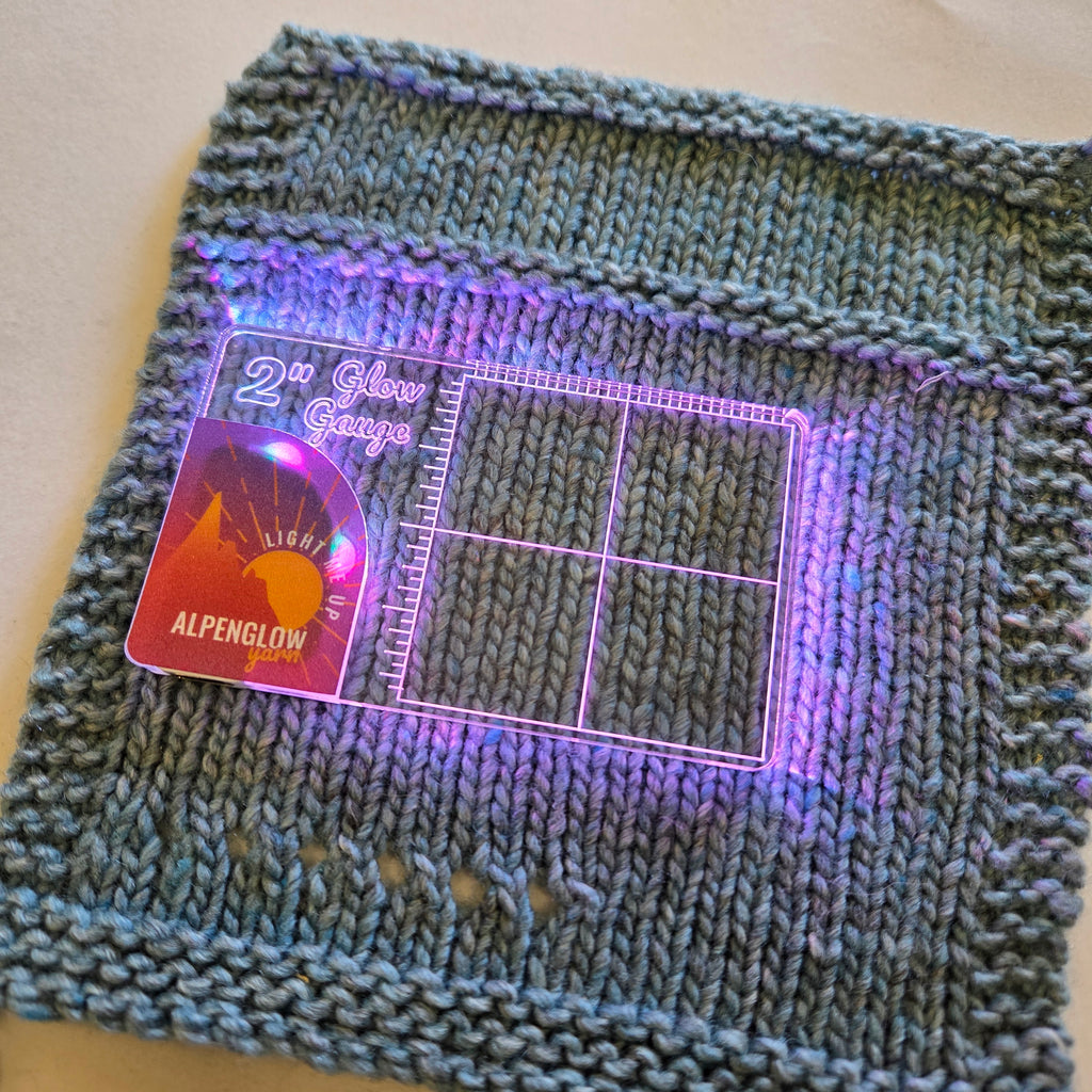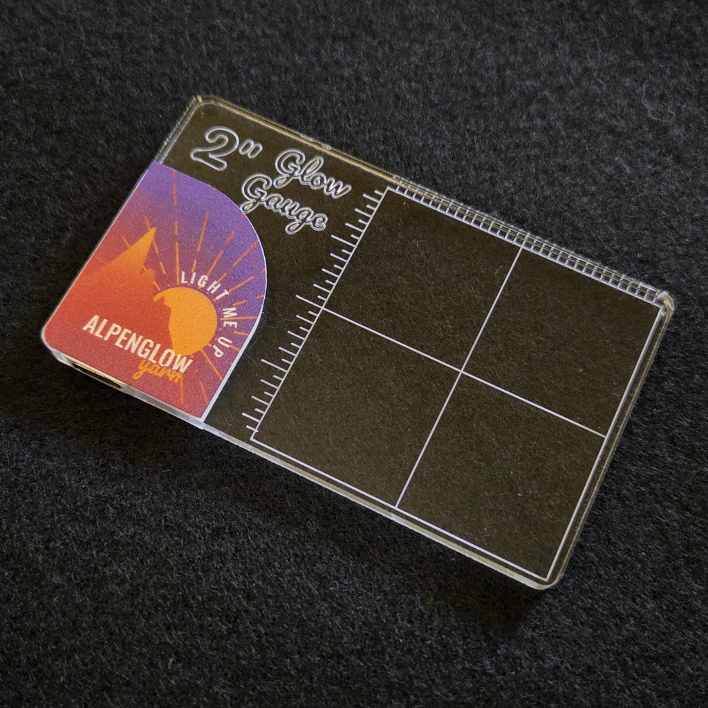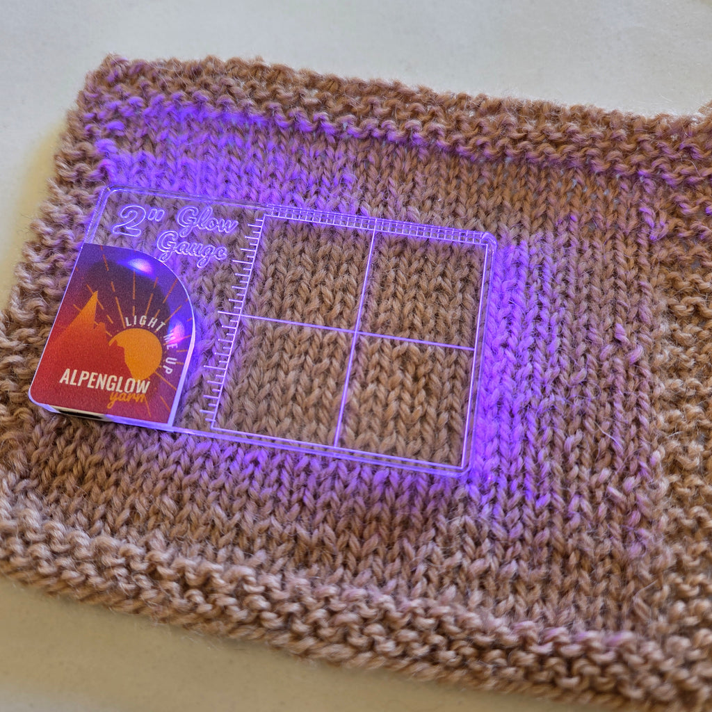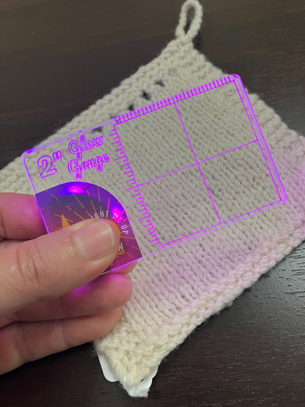 This light-up gauge makes counting stitches so much easier!  The crosshairs at 1 inch help you keep track of your count as you move across your stitches.  It can be set to one of 10 different colors or a slow color-shifting mode if you just can't decide.  The whole gauge is 2 inches, just multiple by 2 to get your gauge over 4 inches.  At about the size of a credit card and 1/4" thick, it's convenient to throw into any project bag.  It comes with a small velvet bag to protect it from scratches, and can be recharged with any USB charger and USB-C cable (not included).