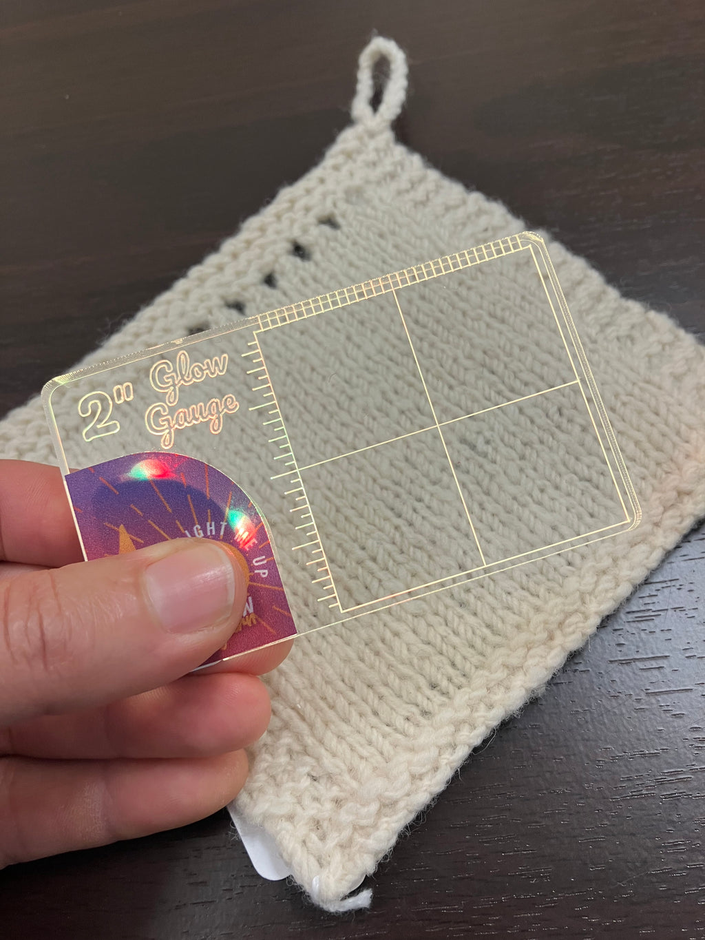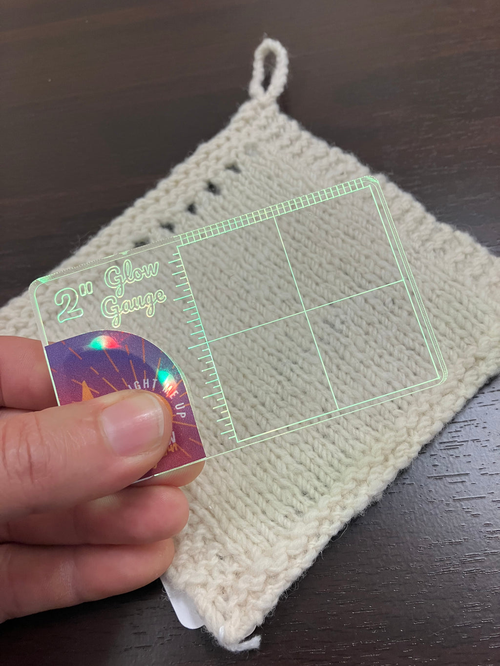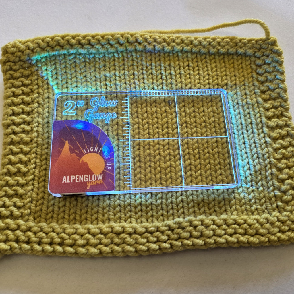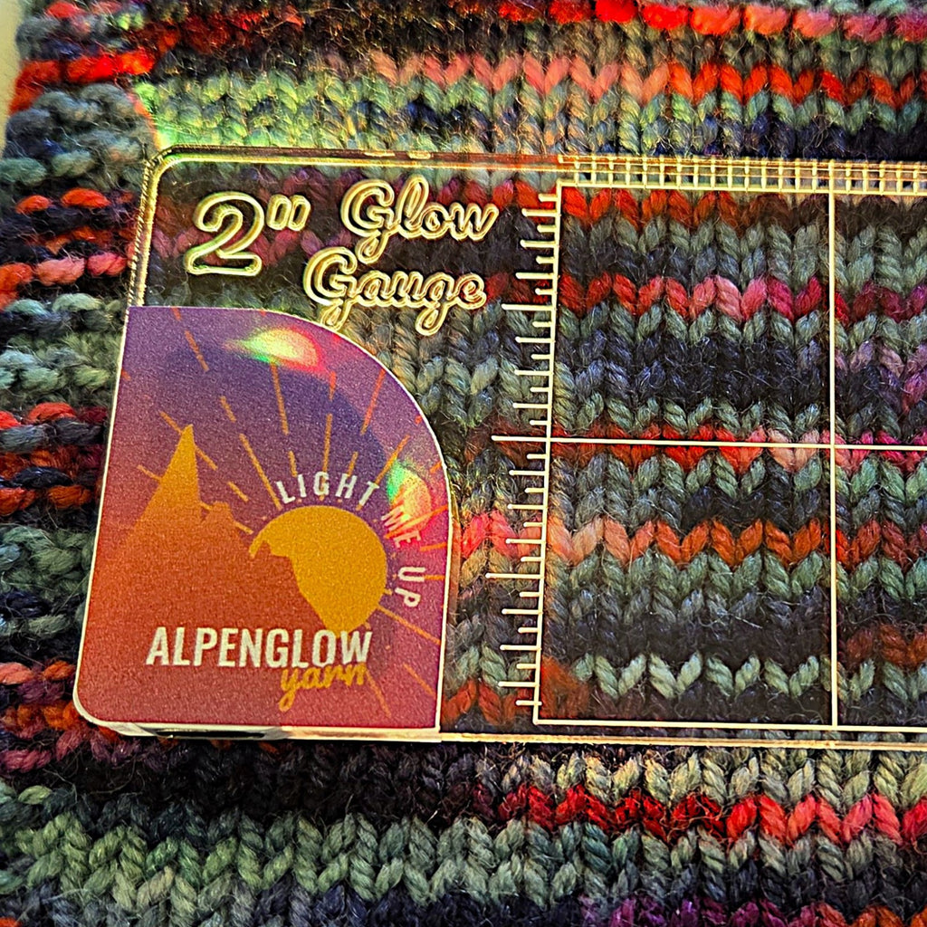 This light-up gauge makes counting stitches so much easier!  The crosshairs at 1 inch help you keep track of your count as you move across your stitches.  It can be set to one of 10 different colors or a slow color-shifting mode if you just can't decide.  The whole gauge is 2 inches, just multiple by 2 to get your gauge over 4 inches.  At about the size of a credit card and 1/4" thick, it's convenient to throw into any project bag.  It comes with a small velvet bag to protect it from scratches, and can be recharged with any USB charger and USB-C cable (not included).